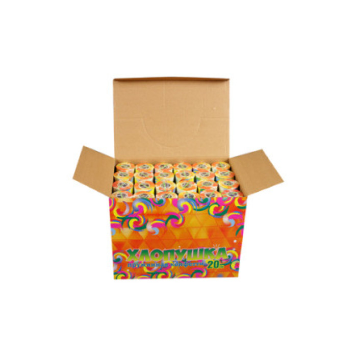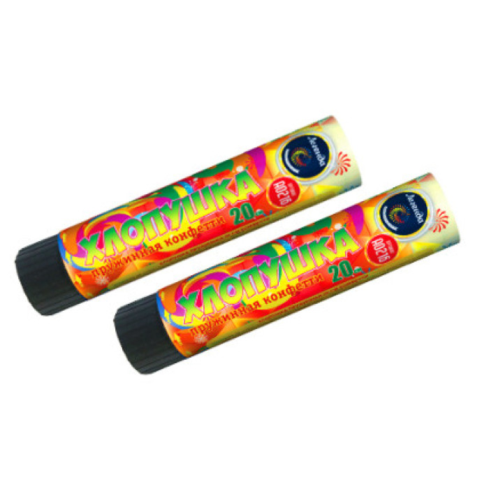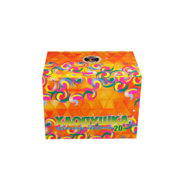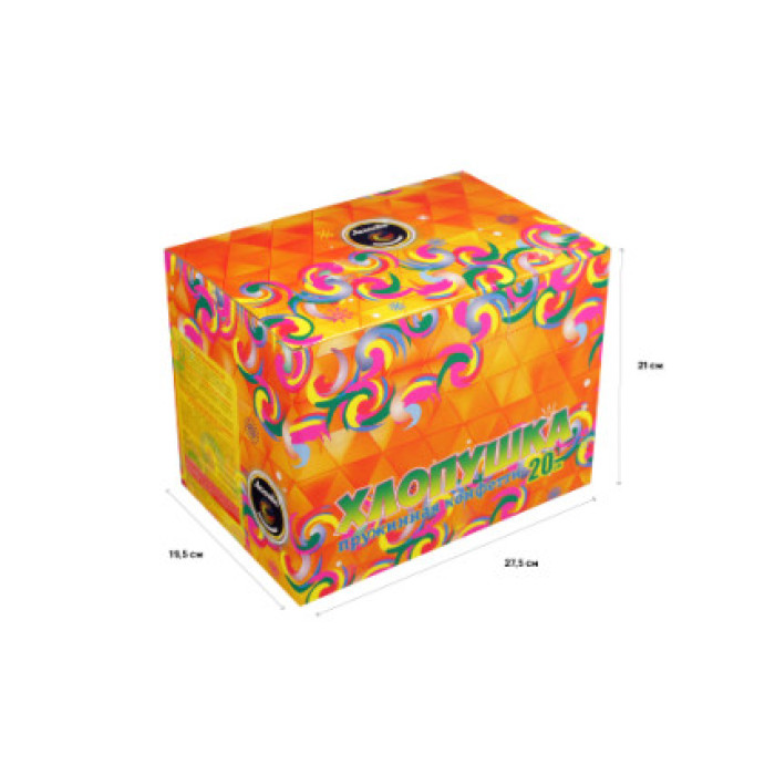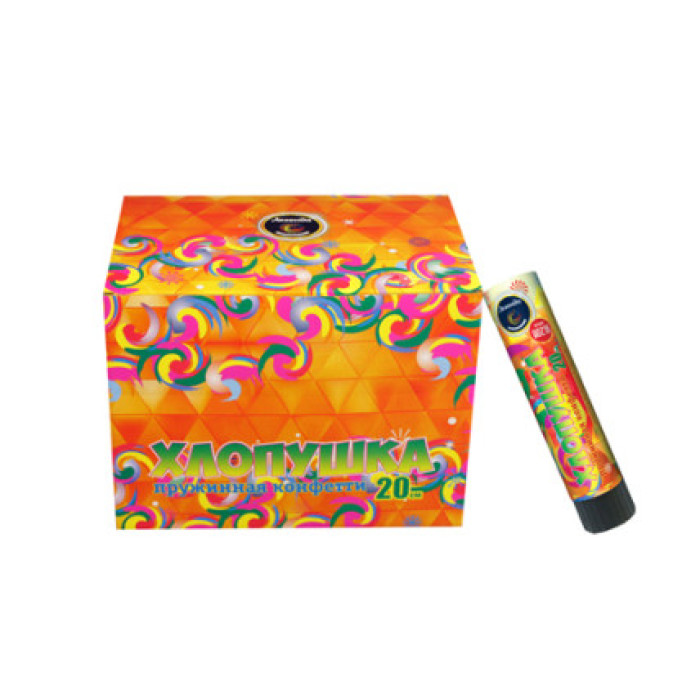 Самая большая пружинная хлопушка из всей линейки продукции имеет длину 20 см. Изделие выстреливает разноцветным конфетти из фольги. Хлопушка активируется с помощью простого механизма. Высота зрелищного эффекта - до 3 метров.