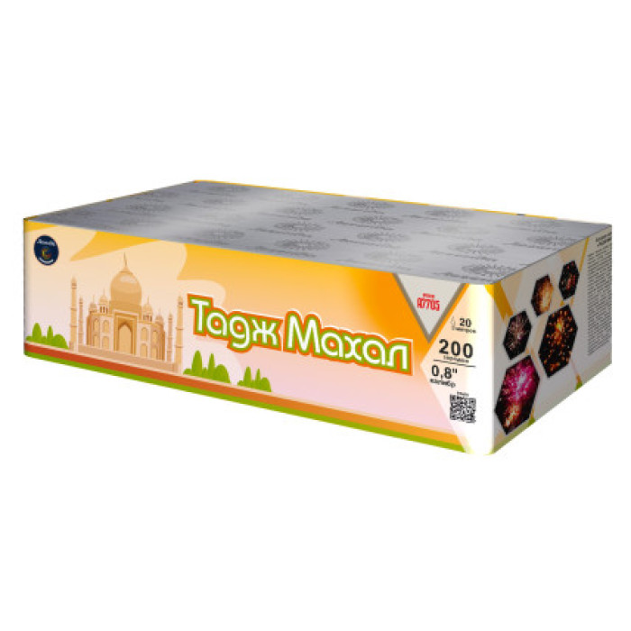 Батарея салютов Тадж Махал 200 залпов, 0,8 калибр зарядов. Эффект: Красный шлейф, раскрывается красными, синими жемчужинами с зеленым мерцанием, зеленый хвост, раскрывается пурпурными жемчужинами с золотым мерцанием, синий шлейф, раскрывается оранжевыми жемчужинами с зелеными стробами, зеленый шлейф, раскрывается зелеными жемчужинами на фоне красного мерцания, синий шлейф, раскрывается серебристыми кокосами с синими жемчужинами, синий шлейф, раскрывается синими жемчужинами, переходящими в тысячу хризантем, красный шлейф, переходящий в красные кокосы в красном мерцании, зеленый шлейф, переходящий в зеленые кокосы с золотым мерцанием, синий шлейф, раскрывается фиолетовыми кокосами в зеленом блеске, красный шлейф, переходящий в красный кокос с белыми стробами, зеленый шлейф, раскрывается зелеными жемчужинами на фоне тысячи хризантем, красный шлейф, раскрывается, синими жемчужинами в трещащем облаке, зеленый шлейф раскрывается фиолетовыми жемчужинами в трещащем облаке, синий шлейф раскрывается зелеными жемчужинами с треском, красный шлейф раскрывается оранжевыми кокосами с треском, красный шлейф, раскрывается красным кокосом с треском, красный шлейф раскрывается парчовой короной с красным мерцанием, в финале красный шлейф, переходящий в тысячу хризантем.